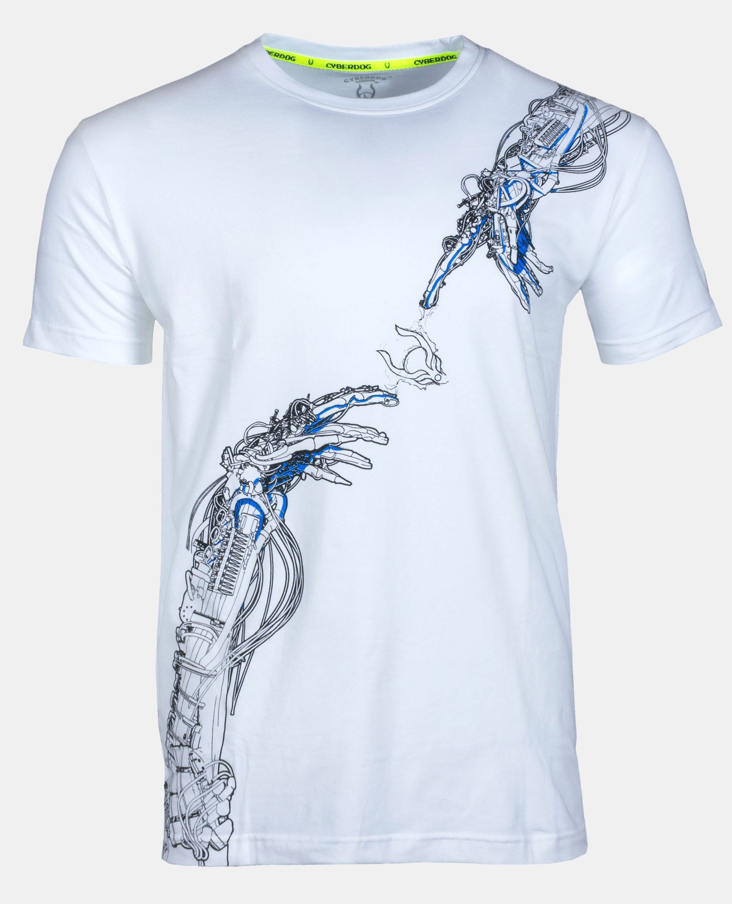 Ignite your wardrobe with the Cyberdog Men's Dragonite T-Shirt! This striking tee features a UV-reactive dragon design that glows brilliantly under blacklight, making it a standout choice for any rave night or festival Crafted from a premium blend of 95% cotton and 5% elastane, it offers both comfort and a flattering fit.