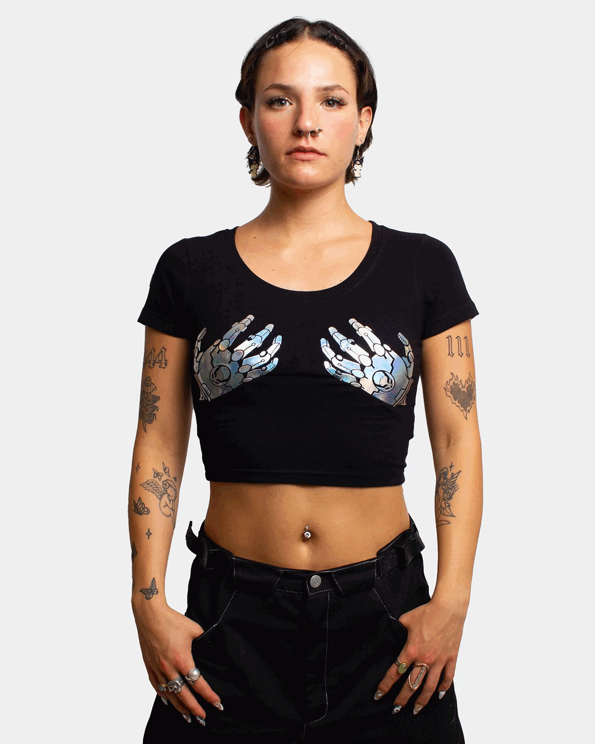 - Silver holographic bionic hands print